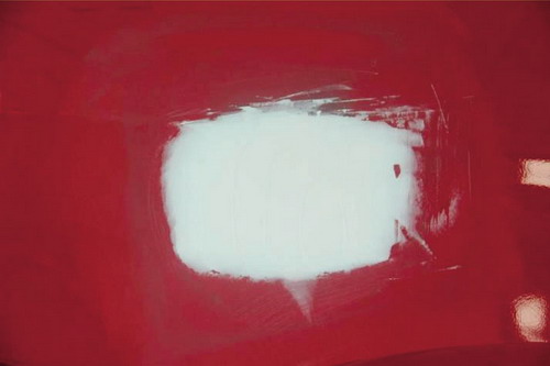 ①砂紙打磨法。在原子灰干燥過程中,可以拿80#的砂紙輕輕地打磨原子灰邊緣薄的部分,檢查原子灰是否已經(jīng)干透。如果沒有干透,則在砂紙上會粘有原子灰;如果已經(jīng)干透,則不會粘上原子灰,并在原子灰上出現(xiàn)堅(jiān)硬的白色痕跡。如圖2-52所示。
